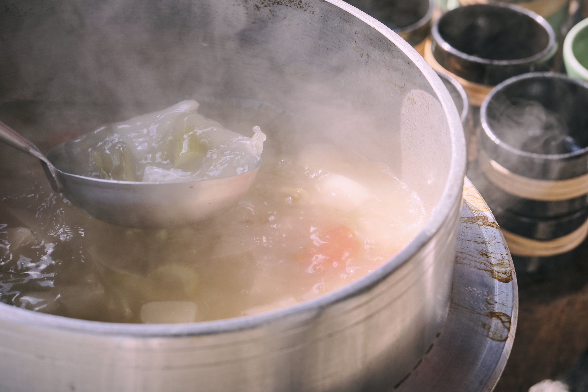 這一碗湯從我們剛抵達的時候就已經冒著煙燉煮著,時不時的就會聞到香味!但在還沒掀開蓋頭來之前,誰都料不到這鍋湯到底藏著什麼好料。直到上菜前排隊領湯的時候才知道,這一碗是在地的三菜一湯(野菜3選一)可續湯、換野菜。樸實的滋味相當甘甜,調味單純暖心也暖胃